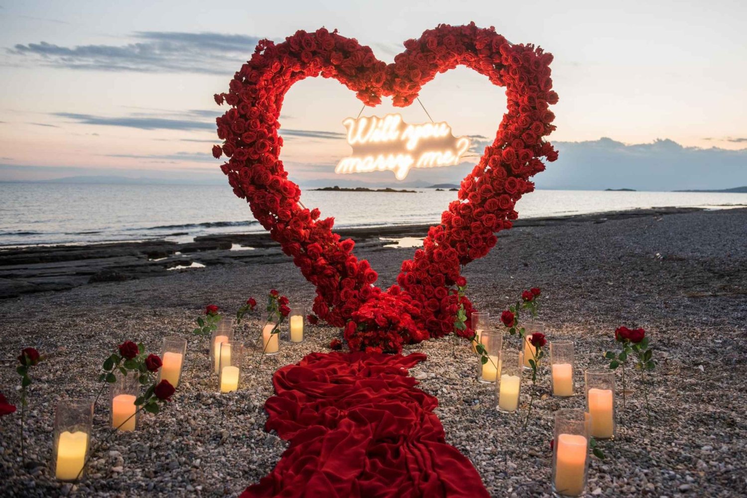 Forestil dig, at du frier på stranden i solnedgangen ved Athens riviera omgivet af stearinlys foran en smuk hjertebue fuld af roser.