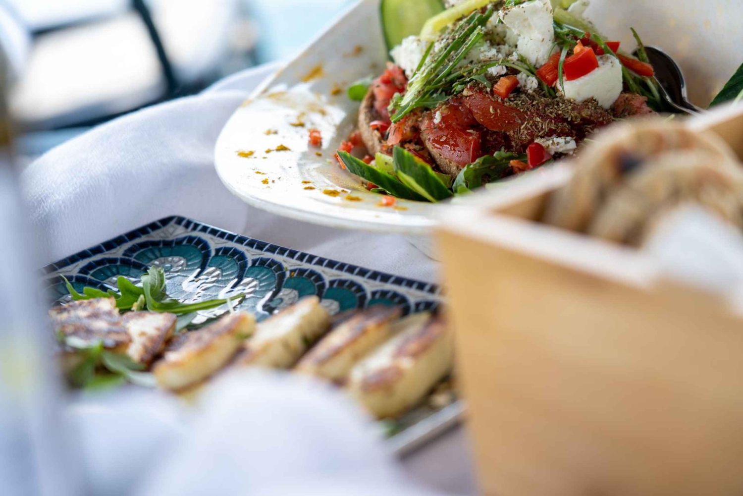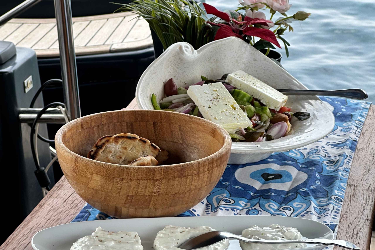 Beginne oder beende einen schönen Tag in Athen auf die beste Art und Weise, draußen auf dem Meer auf einem Segelboot. Genieße an Bord ein authentisches griechisches Festmahl mit 10 verschiedenen Gerichten aus ganz Griechenland sowie einem Glas griechischem Wein oder einem Bier deiner Wahl. An Bord findest du eine gute Auswahl an griechischen Weinen und Bieren, sodass du ein komplettes gastronomisches Erlebnis der Schätze genießen kannst, die uns das griechische Land bietet. Im Preis inbegriffen sind 2 Getränke (Gläser Wein, Bier oder andere Getränke). Danach steht dir eine Speisekarte zur Auswahl zur Verfügung. Triff an Bord deinen Gastgeber und Koch Yannis, der für dich traditionelle, köstliche Rezepte zubereiten wird. Es wird eine einzigartige Kulisse geschaffen, in der unsere Gäste ein schönes Mittag- oder Abendessen auf dem Deck genießen können, während sie die wunderbare Bootsfahrt zur kleinen Insel Ydrousa zum Schwimmen und Schnorcheln genießen. Du kannst dich von uns abholen lassen oder uns einfach im Yacht Club von Amfitheas in Paleo Faliro treffen. Segle etwa eine Stunde lang über die Athener Riviera bis zur kleinen Insel. Während du das Meer und die Sonne genießt, wird der Tisch gedeckt und der Koch beginnt seine Zauberkünste in der Küche. Nach etwa 3 Stunden purer Glückseligkeit ist es Zeit, zum Yachtclub zurückzusegeln, von wo aus du entweder bequem mit dem Taxi, der Straßenbahn/dem Bus weiterfahren oder einfach mit uns vereinbaren kannst, dass wir dich zu deinem Endpunkt bringen. An Bord bekommst du Strandtücher, Schnorchelausrüstung, SUP-Boards, Angelausrüstung und ein Karaoke-Set (das meistens bei privaten Anlässen genutzt wird). Am Ende der Kreuzfahrt bekommst du eine Souvenir-Tasche mit griechischen Leckereien, damit du ein kleines Stück Griechenland mit nach Hause nehmen kannst. Wir freuen uns darauf, dich an Bord zu dieser außergewöhnlichen gastronomischen Erfahrung begrüßen zu dürfen!Includes