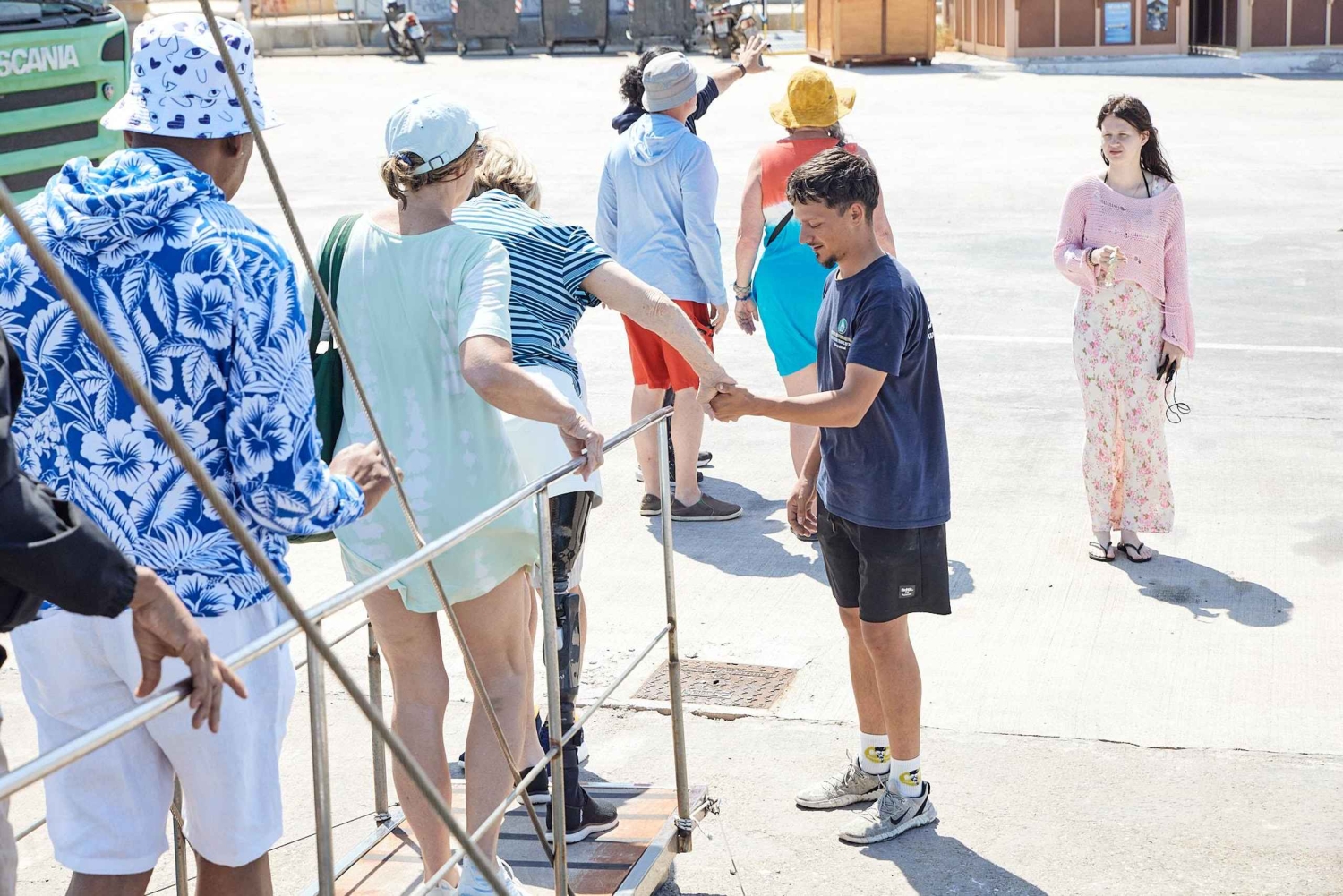 Explora Atenas a tu propio ritmo con un ticket de entrada de 24 horas para el autobús turístico. Sube y baja en lugares emblemáticos como la Acrópolis, el Partenón, Plaka y la plaza Syntagma. Disfruta de comentarios en varios idiomas, vistas panorámicas desde la cubierta superior y acceso ilimitado a la línea de Atenas durante 24 horas. El día de tu crucero, disfruta de un cómodo servicio de recogida en el centro de Atenas y traslado al puerto, donde embarcarás en un velero tradicional de madera. Navega por el golfo Sarónico y descubre tres impresionantes islas:⧏BR/⧐⧏BR/⧐Agistri: un paraíso verde donde podrás relajarte, nadar o participar en una excursión opcional en bicicleta. Egina: una animada isla famosa por sus pistachos, su encantador pueblo portuario y sus ruinas antiguas. A bordo, te recibirán con café, té, zumo y bollería, antes de disfrutar de un almuerzo bufé mediterráneo recién preparado con vino, cerveza y refrescos. Se proporciona equipo de snorkel, flotadores, tumbonas y zonas de sombra para que disfrutes de una experiencia cómoda y divertida.Includes