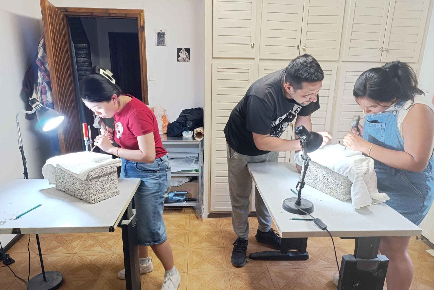 Hola desde Atenas, me llamo Giorgos y acabo de graduarme en la escuela de bellas artes del mármol de la isla de Tinos. A mi lado en esta experiencia estará Georgia, que también se licenció en la escuela de bellas artes del mármol de Tinos, y ahora estudia en la escuela de Bellas Artes de Atenas, en la sección de escultura. Nuestro amor por el mármol creó la necesidad de esta experiencia. La idea general es introducirte en el mundo del mármol, un material que siempre ha sido importante para nuestra civilización. El objetivo es entrar en contacto con las herramientas, su uso y tallar palabras sencillas, como vuestros nombres u otras palabras que queráis tallar en el mármol como recuerdo. Durante toda la duración de la experiencia, yo y mi compañero, estaremos a tu lado y te ayudaremos proporcionándote instrucciones e informaciones, orientándote, sobre las técnicas para que puedas aprender los primeros pasos para la talla artesanal en mármol. En nuestra casa hay un taller interior donde podemos trabajar independientemente de las condiciones meteorológicas. Lo mejor es que nos comunicaremos, trabajaremos y te informaremos sobre los tipos de mármol, las herramientas y la estructura del material.Includes