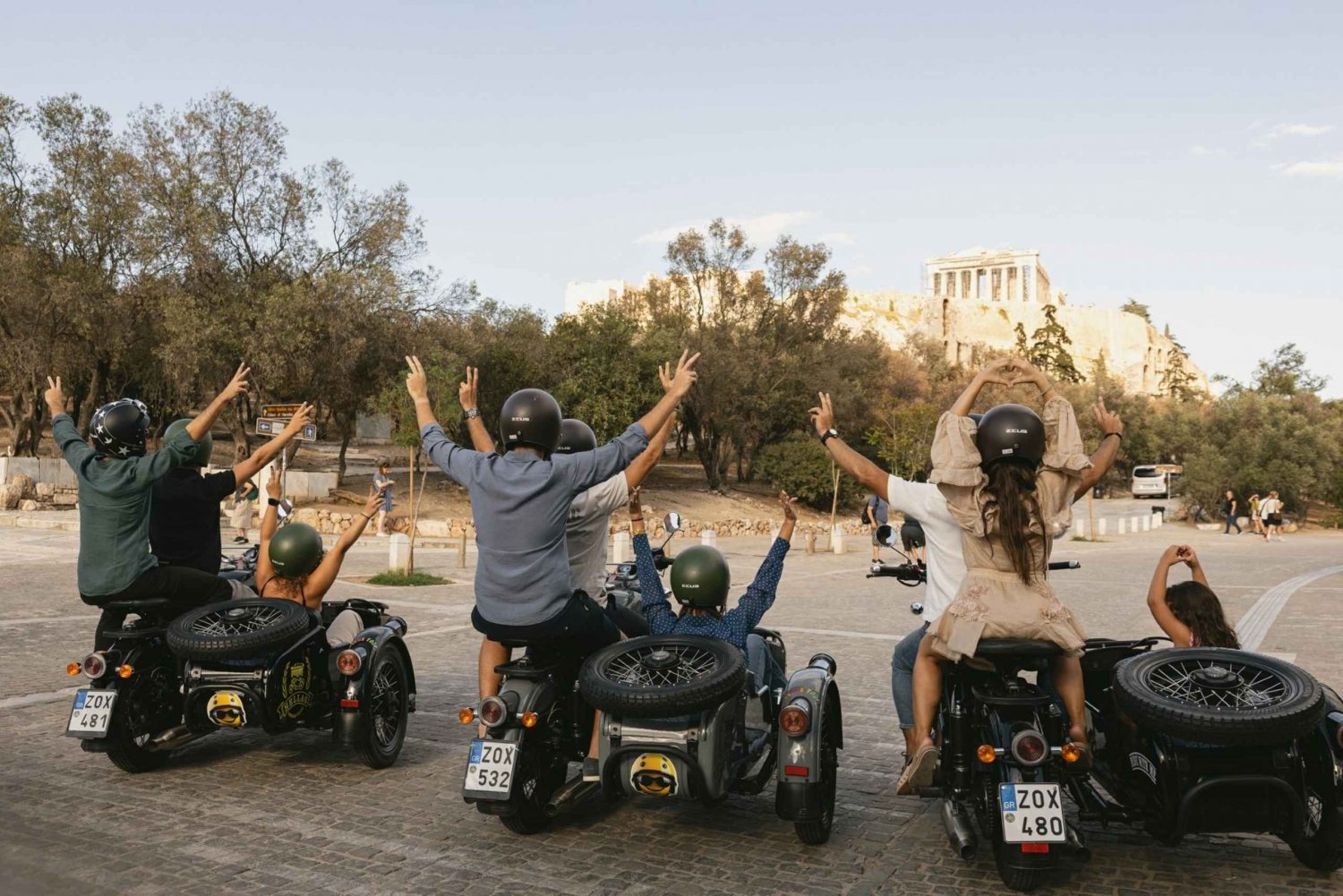 Get to know Athens in a way only locals can show you. In this quick tour, we will avoid traffic and we will show you the most iconic Streets of Plaka and you will have the opportunity to get scenic views of the Acropolis. There is no equivalent tour to this one offered in the city. You will ride with brand new licensed and safe motorcycles that have a sidecar. The 2 passengers can exchange seats so that both can sit at the sidecar. Come feel the unique experience of riding in a sidecar through Athens city. With our sidecar we will quickly drive through the narrow Streets of Plaka, Thisseion, Monastiraki where you can enjoy open air views of the Greatness of Acropolis. We will pass through beautiful traditional streets that you will have the opportunity to take fantastic pictures and videos. Riding in a vintage sidecar is the most instagrammable experience offered in Athens. We guarantee that you will have an exciting time while we drive safely through streets that buses and taxis are unable to get through. Come experience Athens in an adventurous and unique way. Meeting And Pickup You can head directly to the meeting point, Achilleos 65, Athina 10435, and meet us at the Panellinion Parking Vintage Café. Our driver will meet and Greed at the Café where he will brief you and get you prepared for your tour. Alternatively, you can request a pickup from your hotel.Includes
