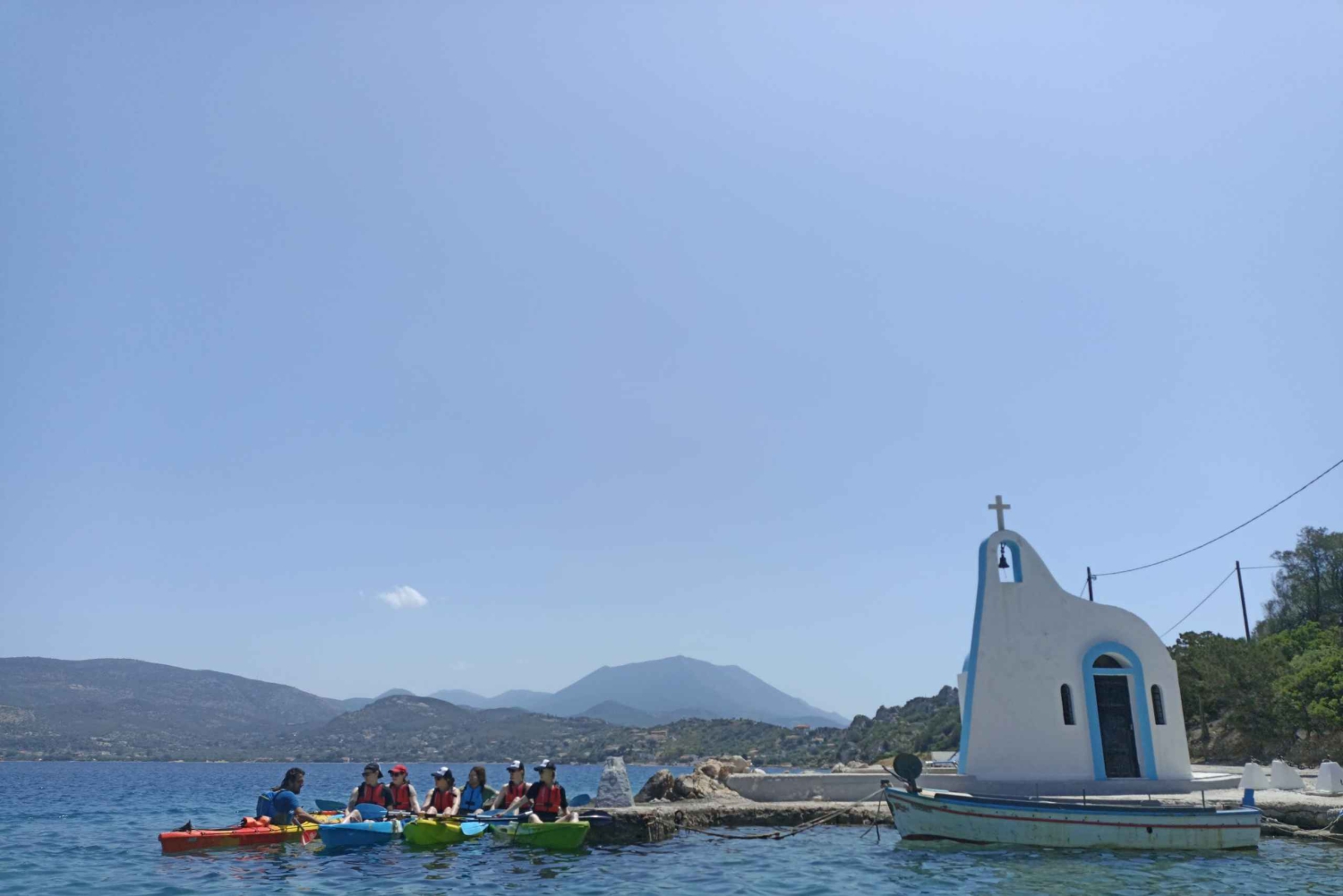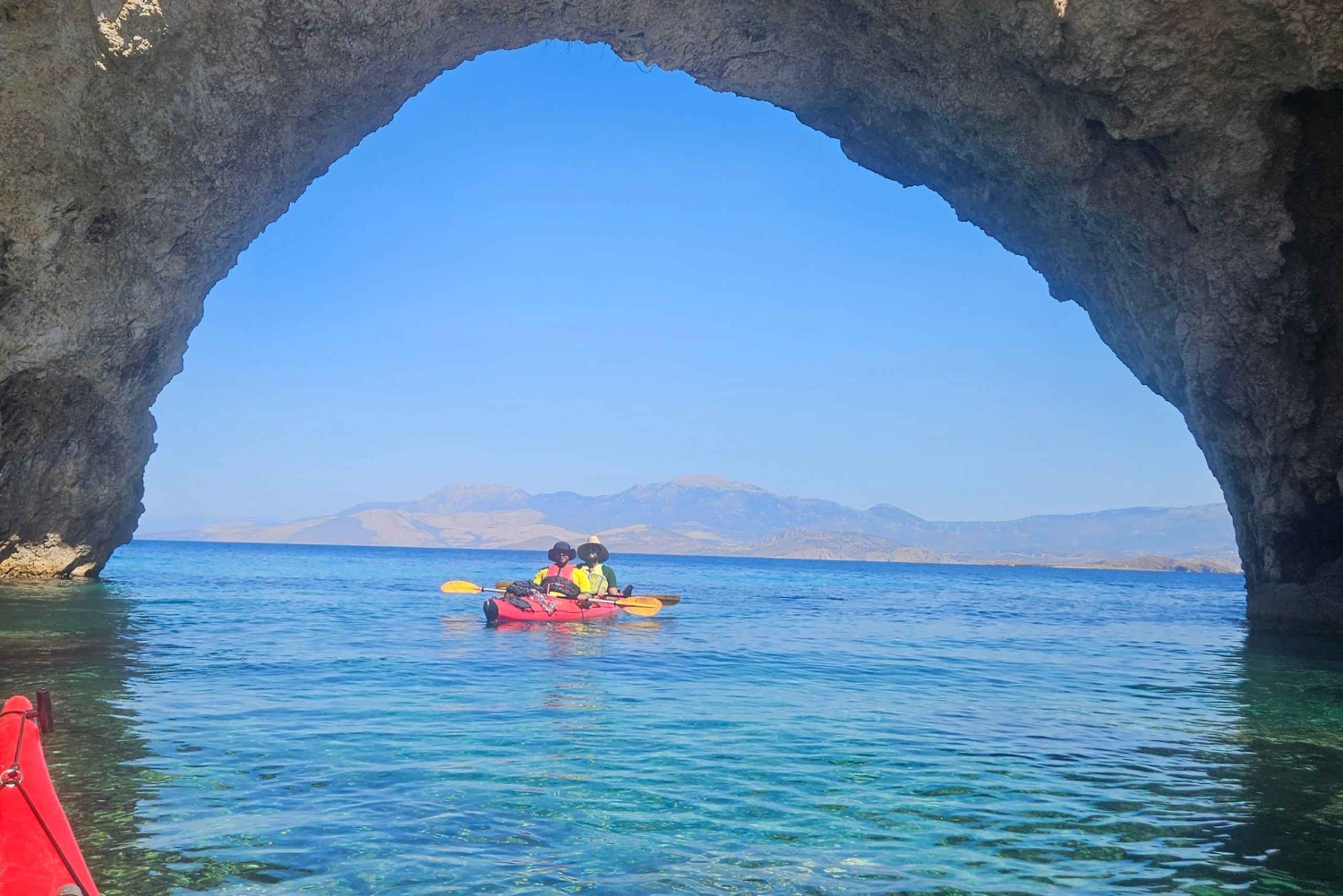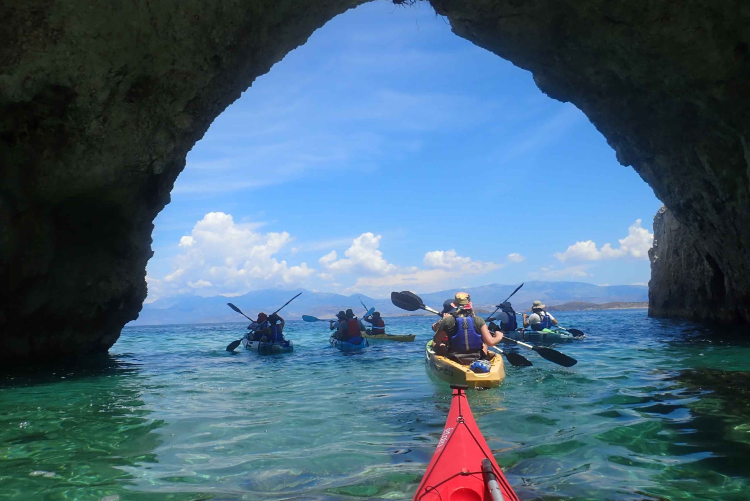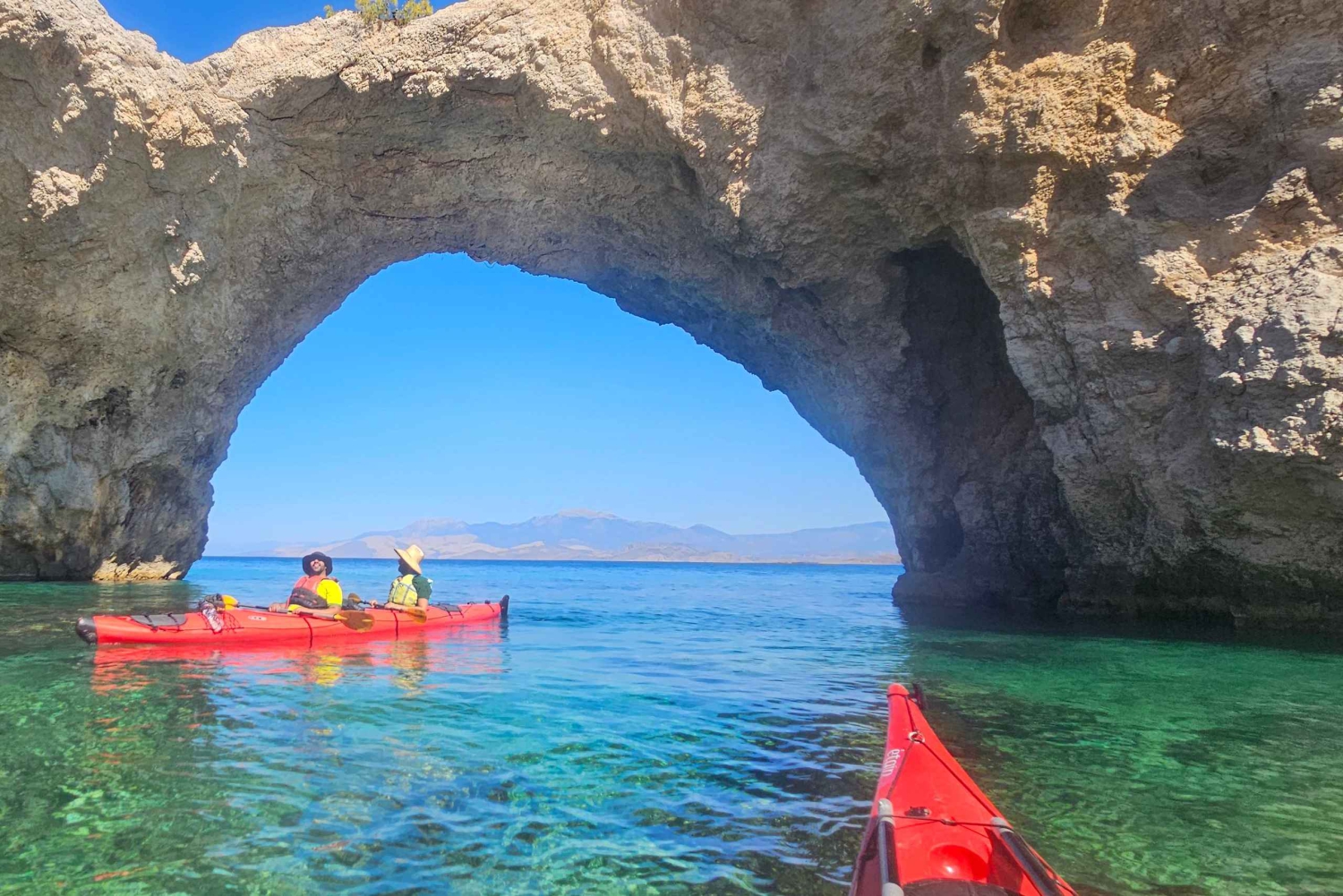 Seikkailumme alkaa Alkyonidoksen rannalta klo 10.00. Sertifioidut oppaat pitävät lyhyen oppitunnin rannalla, melojen ja kajakkien oikeasta käytöstä merellä. Sitten olemme valmiita lähtemään merelle ja aloittamaan seikkailumme. Melomme noin puoli tuntia, kunnes saavutamme upean, rauhallisen rannan, pienen Stravan. Vapaa-aikaa rentoutumiseen rannalla ja uimiseen. Sitten jatkamme matkaamme päästäksemme noin 15 minuutin kuluttua maagiseen paikkaan, jossa paikalliset kutsuvat sitä 'hyljeluolaksi', joka on yksi Korintin puhtaimmista ja koskemattomimmista paikoista. Se on kalliomuodostelma, luonnollinen kaari meren turkoosien vesien yläpuolella. Kaaren sisään astuessa on luola, jonka sisällä on upea ranta, jossa on hienoja, valkoisia kiviä. Jatkamme melontaa tarkkailemalla mielenkiintoisia geologisia muodostumia kivistä ja ohittamalla erilaisia luolia päästäksemme X-rannalle. Tähän pääsee vain meritse. Siinä on uskomattomat vedet, jotka ovat ihanteellisia sukeltamiseen ja uimiseen. Täällä pidämme tauon ja syömme välipalamme. Uinnin ja levon jälkeen aloitamme paluumme. Pysähdymme Fokian luolalle vielä viimeiseen uimiseen ja päädymme Alkyonidoksen rannalle, josta aloitimme.Includes