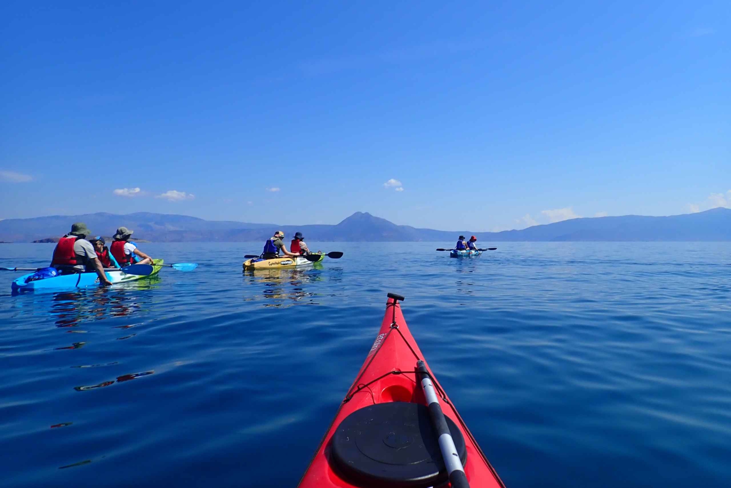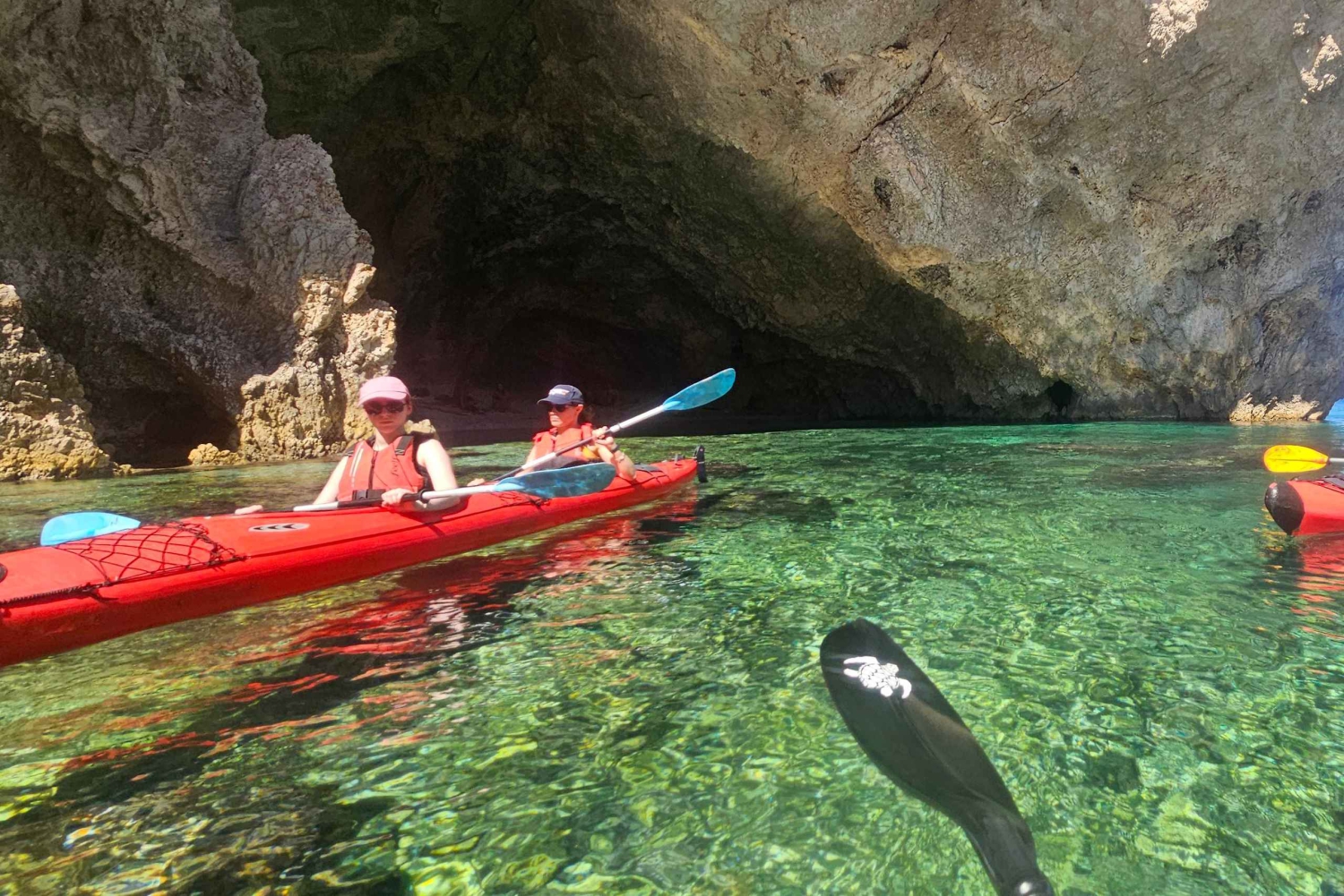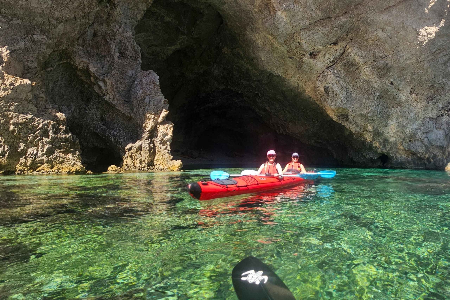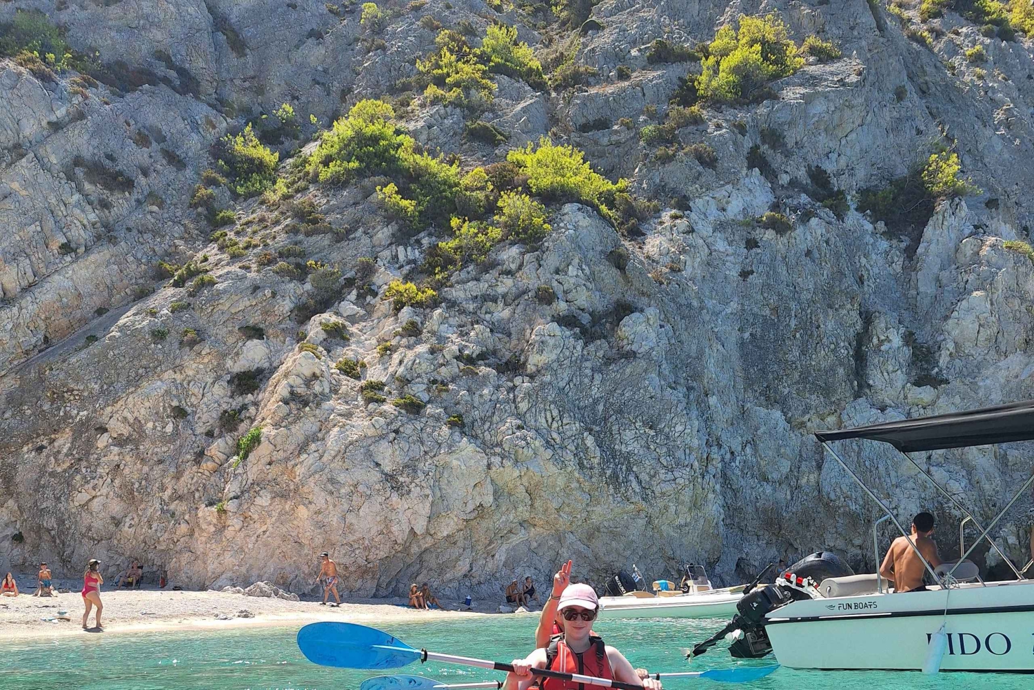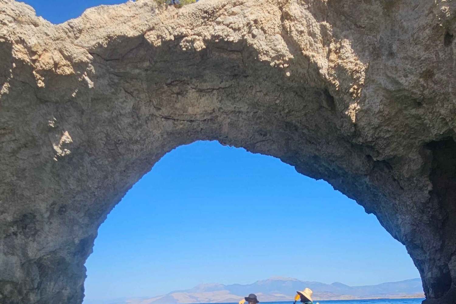 Seikkailumme alkaa Alkyonidoksen rannalta klo 10.00. Sertifioidut oppaat pitävät lyhyen oppitunnin rannalla, melojen ja kajakkien oikeasta käytöstä merellä. Sitten olemme valmiita lähtemään merelle ja aloittamaan seikkailumme. Melomme noin puoli tuntia, kunnes saavutamme upean, rauhallisen rannan, pienen Stravan. Vapaa-aikaa rentoutumiseen rannalla ja uimiseen. Sitten jatkamme matkaamme päästäksemme noin 15 minuutin kuluttua maagiseen paikkaan, jossa paikalliset kutsuvat sitä 'hyljeluolaksi', joka on yksi Korintin puhtaimmista ja koskemattomimmista paikoista. Se on kalliomuodostelma, luonnollinen kaari meren turkoosien vesien yläpuolella. Kaaren sisään astuessa on luola, jonka sisällä on upea ranta, jossa on hienoja, valkoisia kiviä. Jatkamme melontaa tarkkailemalla mielenkiintoisia geologisia muodostumia kivistä ja ohittamalla erilaisia luolia päästäksemme X-rannalle. Tähän pääsee vain meritse. Siinä on uskomattomat vedet, jotka ovat ihanteellisia sukeltamiseen ja uimiseen. Täällä pidämme tauon ja syömme välipalamme. Uinnin ja levon jälkeen aloitamme paluumme. Pysähdymme Fokian luolalle vielä viimeiseen uimiseen ja päädymme Alkyonidoksen rannalle, josta aloitimme.Includes