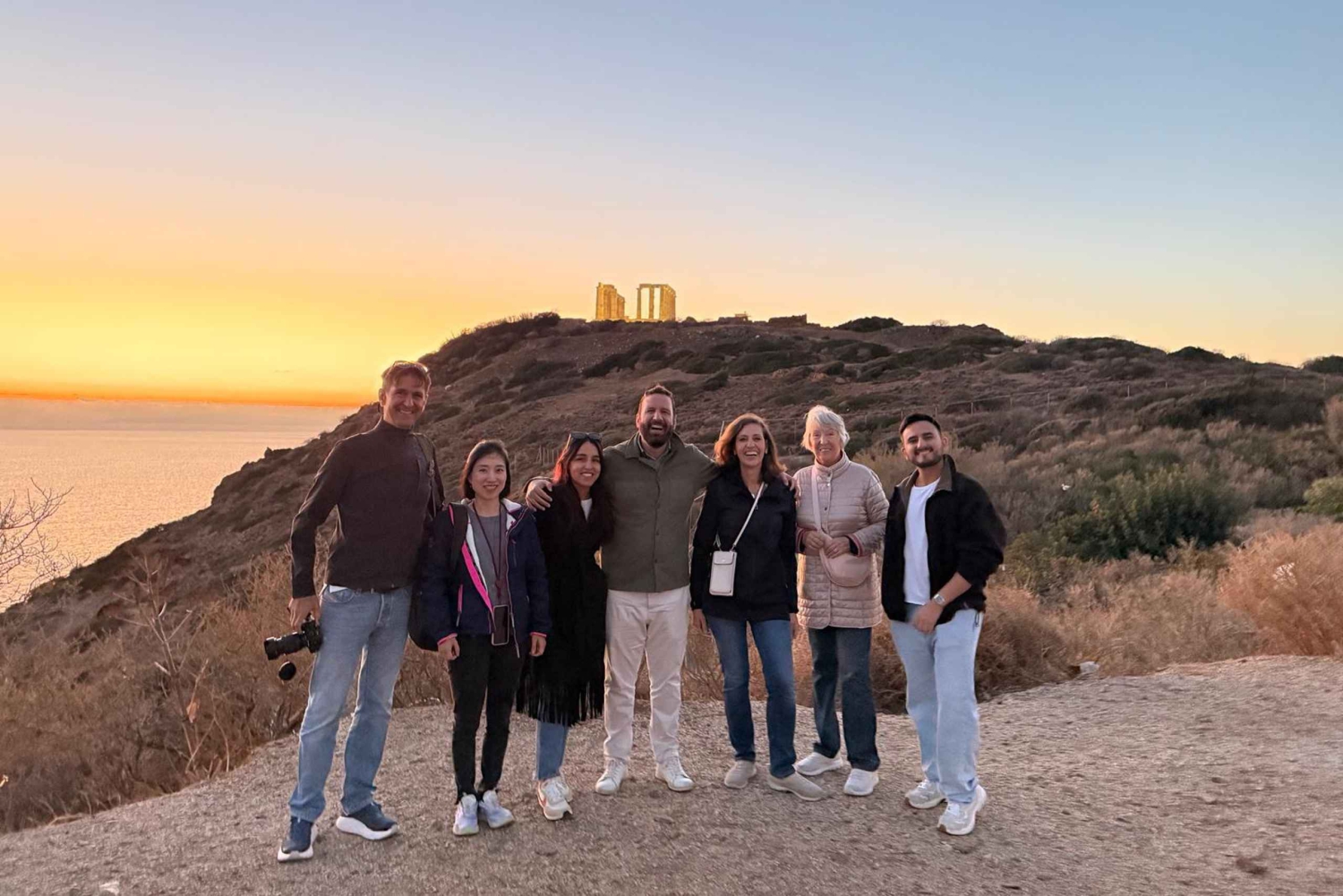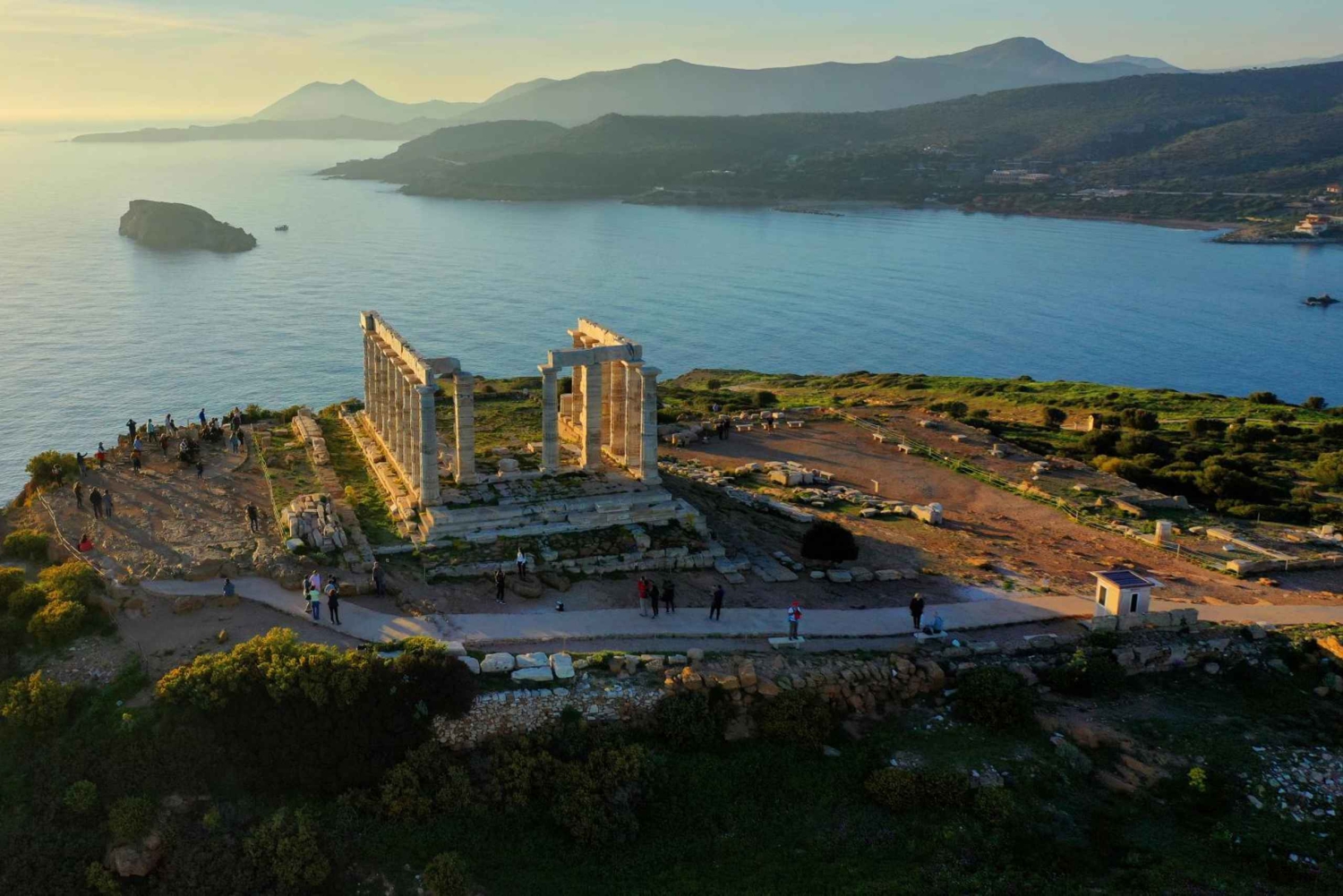 Start med henting fra overnattingsstedet ditt i Aten, og slapp av i et kjøretøy med klimaanlegg mens du nyter det fantastiske landskapet langs den athenske rivieraen. Kjør forbi det glitrende vannet i Vouliagmeni-sjøen og noen av områdets mest prestisjefylte byer. Stopp ved et lokalt bakeri for en dampende kopp fersk gresk kaffe og en søt bougatsa (vaniljekrem). Ta turen til en fantastisk strand med krystallklart vann der du kan svømme (om sommeren) eller puste inn den salte luften. Besøk det imponerende Poseidon-tempelet på Cape Sounio, hvor du har fri tid til å utforske stedet i ditt eget tempo. Beundre den doriske arkitekturen i dette tempelet som ble bygget i Atens gullalder. Føl spenningen ved å besøke et legendarisk sted som ligger på toppen av en klippe på Kapp Sounion. Se solnedgangen fra denne privilegerte posisjonen med panoramautsikt over Egeerhavet og de nærliggende øyene. Etter tempelbesøket kan du ta turen til en lokal taverna hvor du kan kjøpe fersk lokal sjømat, kjøtt eller veganske retter og iskalde drinker før du drar tilbake til hotellet ditt i Athen.Includes