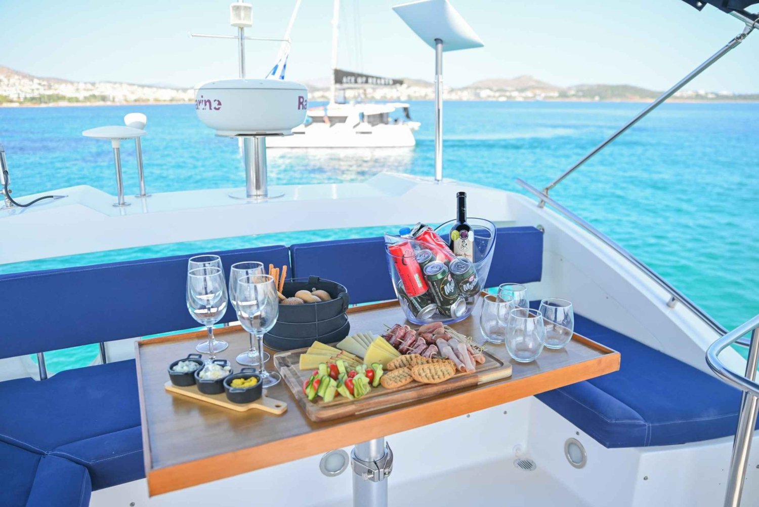Rozpocznij dzień w marinie Alimos, gdzie powita Cię nasz przestronny 44-stopowy jacht motorowy. Po krótkiej odprawie bezpieczeństwa wyruszymy w rejs przez Zatokę Sarońską w kierunku Agistri. Zrzucimy kotwicę w turkusowej zatoce, gdzie będzie można popływać, ponurkować z rurką lub po prostu cieszyć się słońcem przy muzyce i napojach na pokładzie. Następnie popłyniemy na wysepkę Moni, znaną z czystej wody i dziewiczej przyrody — idealne miejsce na kąpiel dla miłośników natury. Potem udamy się do malowniczej wioski Perdika na wyspie Egina. Tam zjesz spokojny lunch w tradycyjnej nadmorskiej tawernie znanej ze świeżych ryb i lokalnego uroku. W drodze powrotnej do Aten zrelaksuj się na pokładzie i rozkoszuj się popołudniową morską bryzą. To idealna propozycja dla małych grup, rodzin lub par poszukujących równowagi między relaksem, lekką przygodą i lokalną kulturą — wszystko to podczas jednego niezapomnianego rejsu.Includes