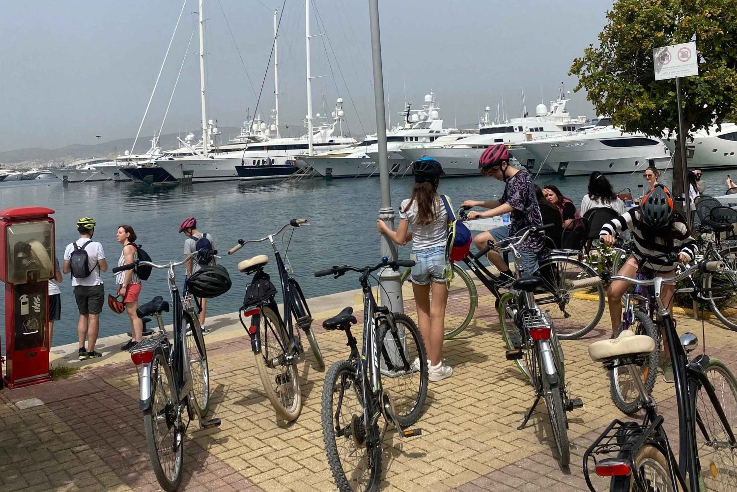 Wysokiej jakości rower Kask ochronny Doświadczony lokalny przewodnik Wycieczka z przewodnikiem po greckich dzielnicach Malownicza przejażdżka wzdłuż wybrzeża Wizyta w parku Stavrosa Niarchosa Zatrzymaj się w Marina Flisvos Widok na historyczny pancernik Averof Zatrzymaj się na plaży, aby popływać i zrelaksować sięEasy cancellation