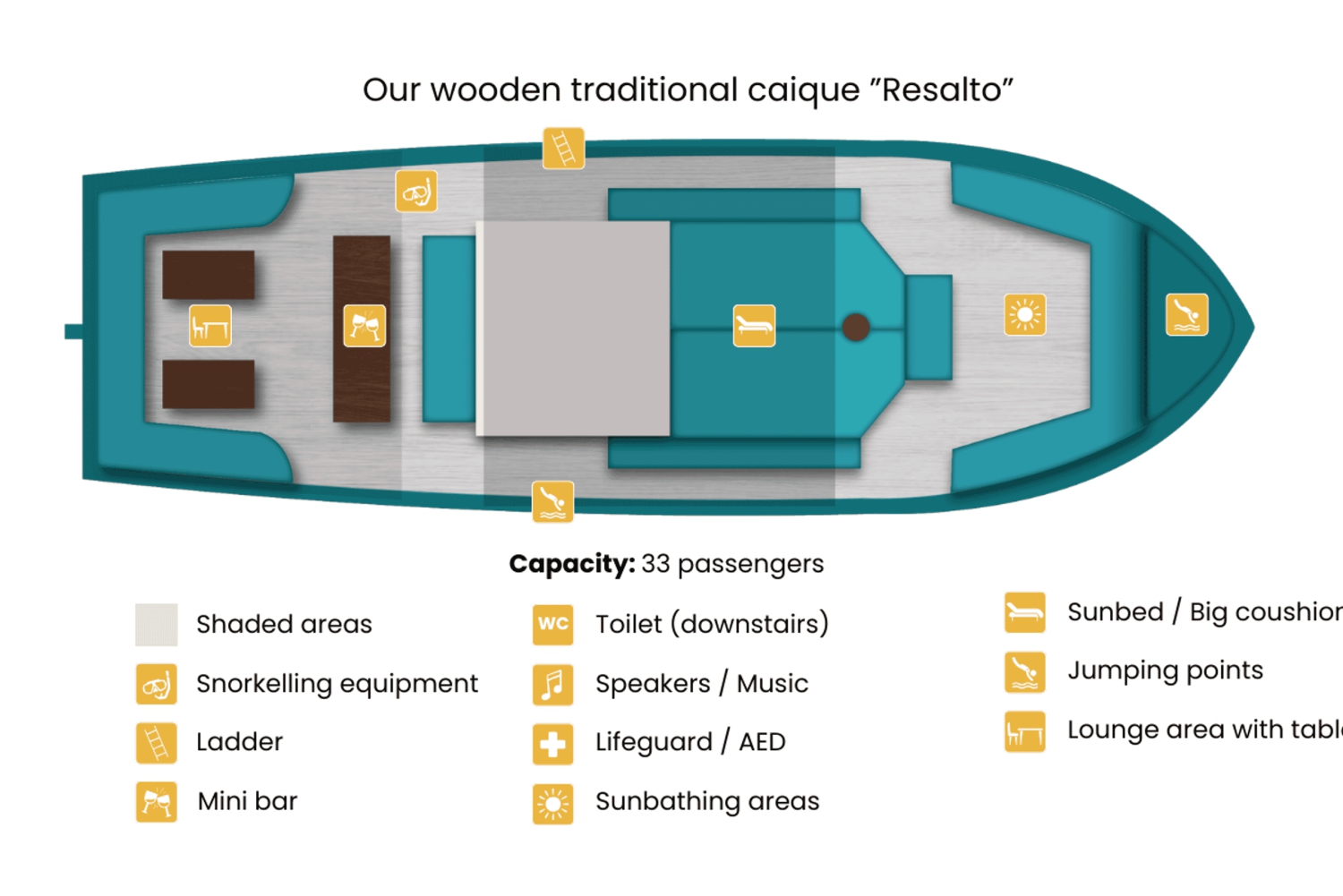 Välkomstkaffe och kakor Grekisk matprovning: lokala bakverk, marinerad fisk, ostsortiment, lokala dipp, pajer Drycker: ett glas vin, ett glas ouzo, ett glas Metaxa, ett glas tsipouro, mastixlikör, vattenflaskor – fler drycker kan köpas på båten. Livräddare ombord Skuggigt område och lounge för solbad Musik ombordImportant Information