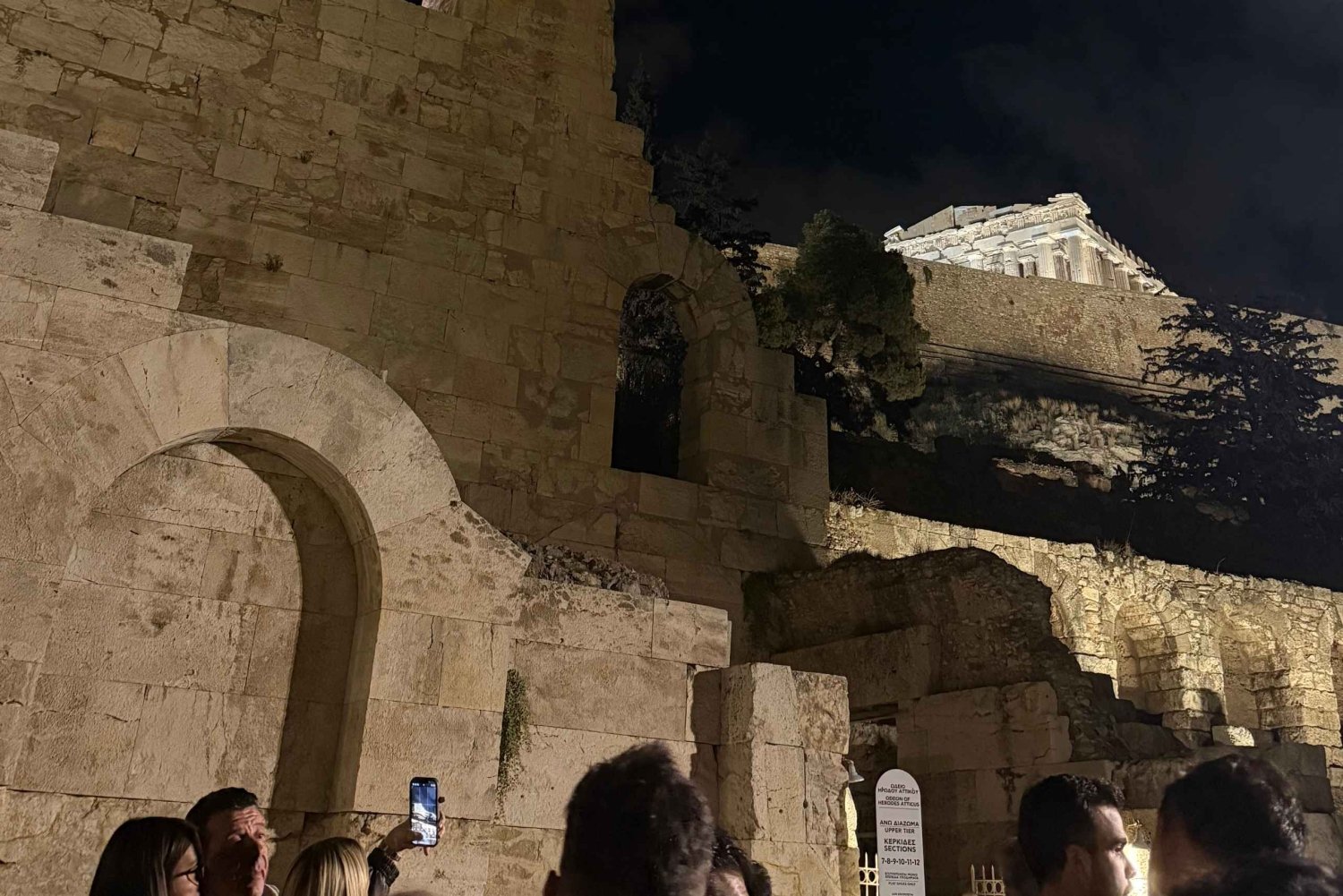 Kliv in i den kusliga, förtrollande sidan av Aten på denna spöklika och mystiska rundvandring. Börja på den antika kyrkogården Kerameikos, där andarna från Atens förflutna fortfarande dröjer sig kvar bland gravar och mausoleum. Vandra genom den antika Agoran, en gång det livliga hjärtat av filosofisk debatt, och föreställ dig Sokrates närvaro som viskar genom ruinerna. Utforska de spöklika korridorerna i Hadrians bibliotek och den romerska agoran, där ekon av forskare, köpmän och gamla konspirationer fortfarande genljuder. Promenera genom Plakas skuggiga gränder och upptäck dolda berättelser om medeltida spöken, bysantinska andar och urbana legender. Gå runt basen av den majestätiska Akropolis, där myter, ritualer och filosofiska viskningar blandas med skymningens bleknande ljus. Turen kulminerar vid den magnifika Odeon of Herodes Atticus, en antik teater som lever med ekon av tragedi, musik och tidlösa andar. Med berättande, stämningsfulla stopp och kusliga lokala legender förvandlar denna tur Aten till en stad av skuggor, hemligheter och spöklika möten.Includes